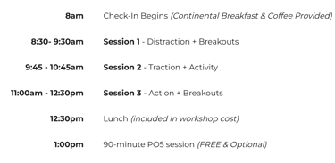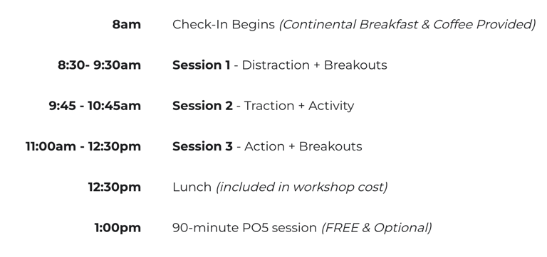 You can expect a highly interactive experience that blends teaching, group discussion, personal reflection, and strategic planning. You'll leave with actionable tools, a 90-day action plan, and a deeper sense of clarity around your priorities.